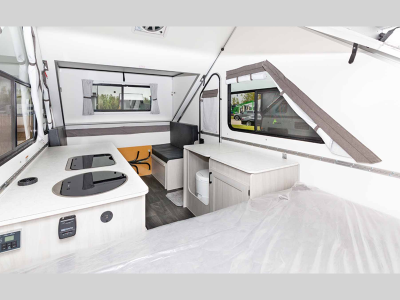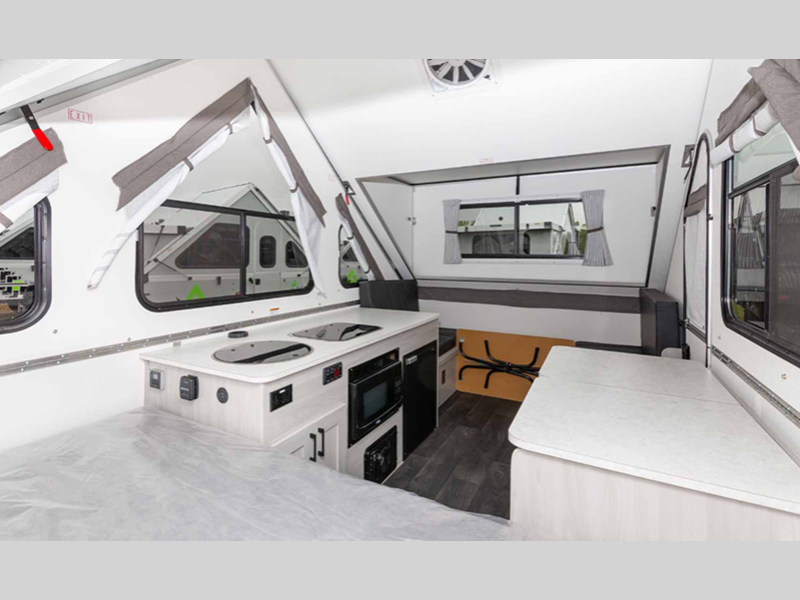 Each is built lightweight with an Azdel composite roof/sidewalls, and includes aluminum wheels, a Dexter rubber torsion axle, and a gray exterior fiberglass. There are also 14" tires, four stabilizer jacks, plus high wind lift assist. The interior offers 30% more storage room, more living space, taller counter tops, a taller bed, and the highest capacity chassis in the Aliner brand.